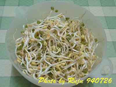2. 將浸種過而膨脹的種子倒入茶壺中,每日早、中、晚各換水一次,由壺嘴加水,浸數秒鐘,再將水倒乾,(換水次數隨氣溫增高可酌增一次)。(如此約48天可採收,可分數次採收食用。)