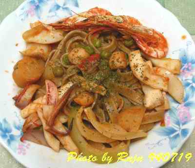 翻翻冰箱找到了一些海鮮(中捲、生鮑魚、生干貝、珍珠干貝、明蝦),還有之前買的杏鮑菇、洋蔥、冷凍碗豆仁,就想說那把之前同學給我的草菇義大利麵條煮來吃看看唄。![]()