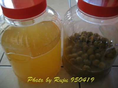 4/19把浸泡脆梅的湯汁取部份倒入右邊瀝出的梅粒中,讓它繼續發酵。