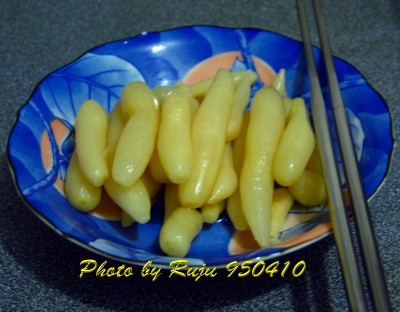 二十日大根,差不多是手指頭大小,是過年時婆婆買的,很好吃喔!其實這樣一盤沒節制的話,我一個人一邊煮菜就可以一邊把它解決了。因為浸得比較久有點變色了,原本是白一點像一般蘿蔔的顏色。這個早就吃完了,浸泡的湯汁被我拿去醃今年的第三批韓式泡菜了,因為我忘記買蘿蔔了。