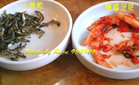 這也是配菜,小魚乾很香也很鹹,泡菜也是鹹,不過他們都會給一壺冰水。