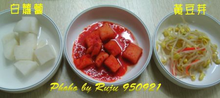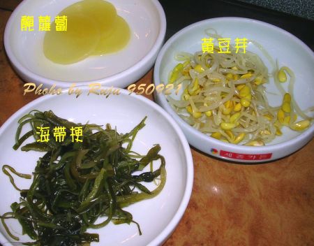 配菜,醃白蘿蔔,酸酸甜甜的,好吃;紅色的忘記是蘿蔔還是大頭菜了,稍微辣辣的,偏鹹味;涼拌黃豆芽也很好吃。