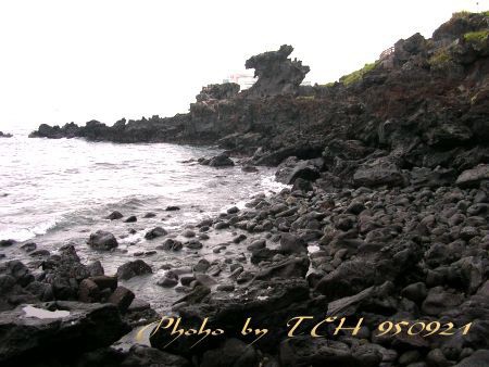 第一天的旅遊點是龍頭岩,由漢拏山火山口噴出的熔岩在海面上凝結而成的,因模樣有如龍頭而得名,海岸邊就有海女搭的帳棚,聽說是賣新鮮的海鮮(小章魚)之類的,我因為腳傷未癒,所以無法去一探究竟。
