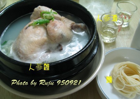 人蔘雞是第一天的晚餐,我覺得還好,這是一人份,一整隻雞肚裡面塞滿了米、生人蔘、紅棗之類的隔水燉幾個小時,上面點綴的是蔥花,人蔘酒跟麵條可以加入湯中一起食用,我覺得湯比肉好吃,這樣一份對我而言覺得太飽了,這餐就算有湯,還是少不了一壺水。