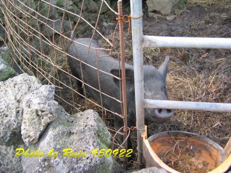飼養在民俗村中的黑毛豬,現在應該是吃飼料的吧!以前他們的豬都是養在廁所底下附近,用來專門吃排泄物兼擦女生屁屁的;男生的屁屁就得交給廁所旁邊的樹葉還是樹枝(忘了)囉!所以他們的廁所旁邊都會種2棵樹,通常其中一棵會有香味,可用又可防臭,而且一面上廁所還得拿根棒子在前面揮趕,以防止豬隻進入底下的通道,以免豬隻誤食。。。而造成永久的遺憾,真是天下之大無奇不有,蠻有趣也蠻噁心的,因為接下來的午餐就是吃黑毛豬燒烤。![]()