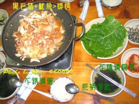 這家好像就是上次吃人蔘雞那家餐廳,這個燒烤還蠻好吃的,黑毛豬+魷魚+高麗菜+高湯,用旁邊的葉子包著吃。