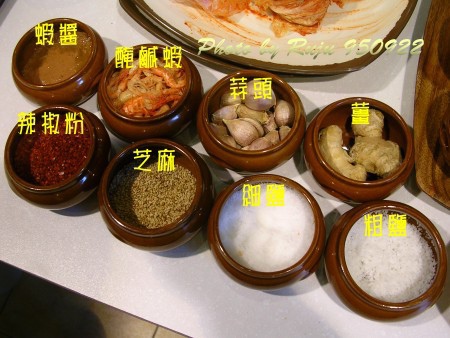 將以上的材料(除醃鹹蝦、細鹽、粗鹽之外)+水梨--磨成泥之後,加入一些紅蘿蔔絲、細蔥段(或韭菜切段)就是醃料了。