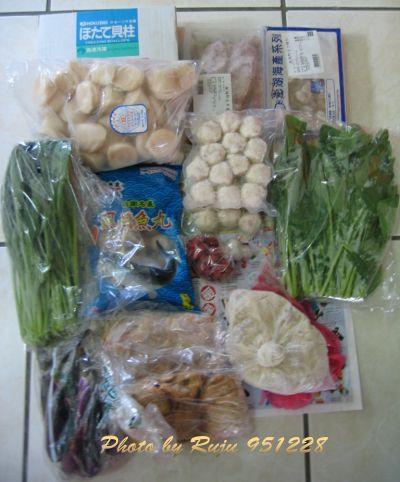 中間左邊是小松菜(白菜的一種吧!);虱目魚丸;花枝丸;紅紅的是主聯請的洛神花脆片<太甜了>;芥藍。