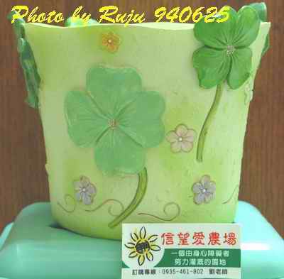 那幸運草花器是我經過賣盆栽的店家看到他們在擺這個盆子,我一開始以為是她們在賣的,問過之後,她們告訴我說是在過去幾家的信望愛農場攤位買的,所以我就忍不住去敗了一個回家囉!攤主還告訴我她們其實是出來義賣的,所得是捐給信望愛農場幫助弱勢團體的,還一直跟我道謝呢!真拍謝!我只好一直回她說:不會啦!不要客氣啦!