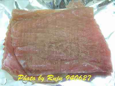 鮪魚肚(不是黑鮪喔! 這種顏色比較淺,不過與黑鮪相比,我比較喜歡這種鮪魚,感覺黑鮪比較適合生吃,味道也比較重,這種鮪魚熟食比黑鮪柔嫩好吃又比較便宜。)