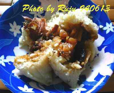 這粽子內容有豬肉、乾蝦仁、油蔥、小捲乾、乾香菇、乾干貝(、花生、蛋黃--師兄不吃這兩樣,所以有些有加有些没。),米是沒炒過且没加料的白糯米,這是婆婆娘家(台南縣)的口味啦!他們家兄弟喜歡也習慣這樣的家鄉味了,我覺得還不錯喔!只是這次的米不夠Q,這種粽子吃起來米的部分應該是很QQ的口感,不過因為自己只是坐享其成,所以還是很感恩的吃光光囉!