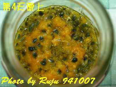 這次會培養百香果酵母,是我之前買了一些百香果回家,最後剩下幾顆,眼看它就要爛了,不處理是不行了,後來把它們剖開挖出裡面可食用的部分,冰在冰箱中,但是過了好多天我都忘記去吃它,10/4晚上本想取出丟棄,可是它竟然還沒壞,而且還香的很哩,突然一個念頭閃過,那就把它拿來培養酵母看看,成功了就繼續養,失敗了就算是我也曾經努力過了呀,就因為這樣,我又開始了養酵生活,不知道這次能持續多久,不過這罐酵頭真不愧是"百香果"養出來的,果然是-----香的哩!
