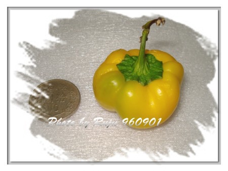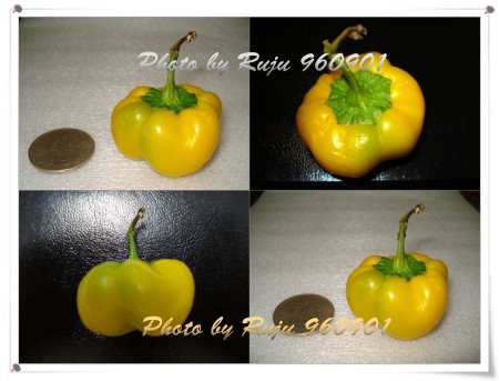 剛剛上Yahoo!知識+找到跟它很像的照片,如果是辣椒應該叫做南瓜辣椒,而非燈籠辣椒,可是顏色又不一樣,網站上的辣椒照片是由綠色轉紅的,這個是由綠轉黃的,而且蒂頭部份看起來就像甜椒(辣椒蒂頭好像比較小),辣椒底部比較圓、比較小,所以不知道它到底是什麼?等我煮它時答案就能揭曉了。