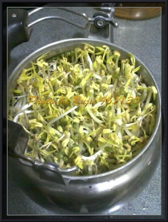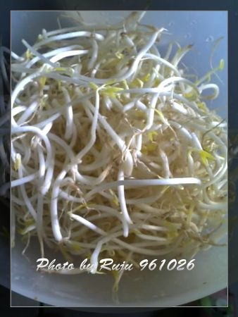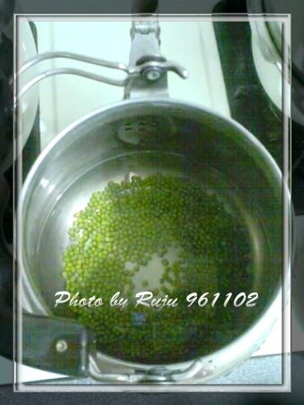 因為前陣子菜不好買,於是又興起自己發綠豆芽的念頭,某天晚上取了4/10的一般量米杯的綠豆,洗過後浸入3L的不鏽鋼茶壺中,以過濾水浸約8小時,從壺口倒掉浸泡的水,就開始發豆芽囉!由這之後起豆子不能一直浸泡在水中,而是要每隔約8~12小時由水壺口處加水(每次加入的水量最好都能淹過內容物高度。),浸約10分鐘,再由壺口處將水全部倒出。(最重要的是:發豆芽的過程中最好不要打開蓋子,也就是不要讓豆芽寶寶見光啦!)
