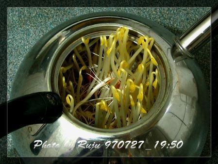 (因為豆芽會一直長高,所以我加的水量會逐次增加,以免在上面的豆芽會吸不到水,倒掉水盡量小心,別使剛長出的芽受傷。)