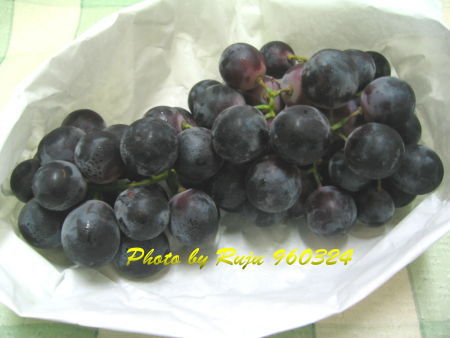 爸媽給的葡萄,很新鮮(梗都還是綠的,果粉也都還在),很清甜爽口(酸的不多),是進口的葡萄,不知道品種,只知道不是巨峰也不是黑后,給了我們一箱,裡面有9份,顏色與黑的巨峰相近。