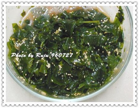 1. 將海帶芽洗過3次左右(洗去上面附有的鹽巴,它會膨脹成原來的2倍),最後一次用過濾水或飲用水,捏乾。