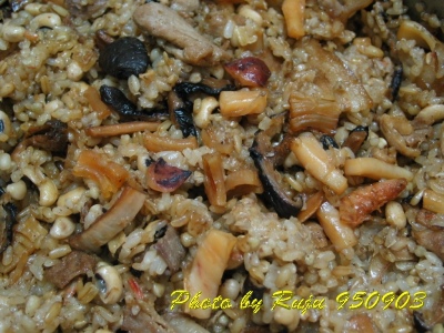 5. 等糯米飯熟了,燜約10分鐘之後,取出拌入(4)、一些香油,拌勻即可,試試鹹淡,放回電鍋中再回蒸一次,這樣可使整體味道更融合。【香油也可以最後起鍋時再加入。】