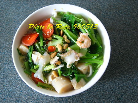 紅蘿蔔片先煮((加點食用油一起下鍋,因為有VitA<脂溶性>先質的關係)),生干貝1/4大小、主聯沙蝦仁、青菜切段,鮑魚片,加點味霖、烹大師調味,起鍋後撒上熟芝麻、熟松子。