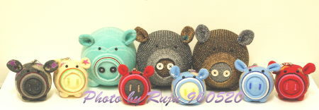 (因為看到朋友做了豬寶寶,覺得很可愛,所以也動手做了一些,可以用來當吊飾,左2黃色&右2藍色的豬寶寶已經被老公的同事買走了 __ ,這是先前留的大合照。