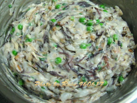 ),青豆仁(約拳頭大小),青蔥末(3支),{牛蒡絲(半支,浸醋水防氧化),香菇末(4大朵)--此兩者可省略,感覺比較搶味,如果單獨使用,味道應該很好。}