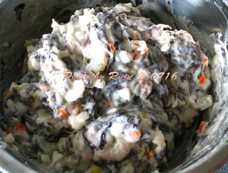 這次是1斤旗魚漿+1斤主聯花枝漿+半斤主聯野生沙蝦仁+新鮮海苔+紅蘿蔔丁(6mm大小)+豆薯丁+蔥花+主聯芹菜乾+牛蒡圓薄切片+一般調味料---做成的。