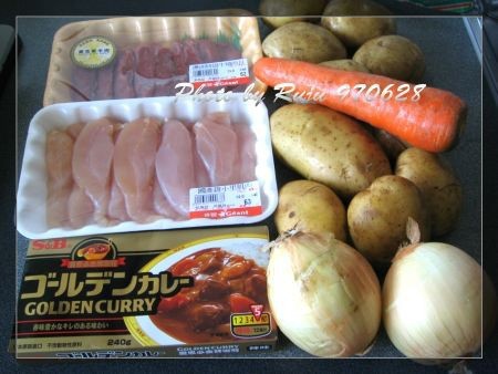 這次的材料有:洋蔥、馬鈴薯、胡蘿蔔、咖哩塊(這次用S&B金牌咖哩塊-辣味)、雞柳條、澳洲特級牛燒肉片(這是哪邊的肉啊?牛腩嗎?我不清楚ㄟ,我在愛買的冷藏櫃買的。)