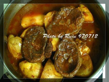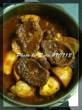 取出我的淺快鍋,加了點油,先炒香洋蔥、蒜片,再把肉有切口的地方稍微煎一下,鋪在洋蔥上面,放入馬鈴薯,倒入浸牛肉的那些紅酒,番茄醬約23大匙,一點鹽,香料包放上面,就這樣,直到快鍋出聲音(我的快鍋是出現兩條白線)後再以小小火煮2分鐘,熄火,直到聽到可以開鍋的聲音,開蓋取出香料包(我怕香料味過重)。