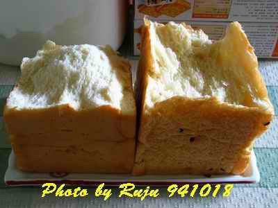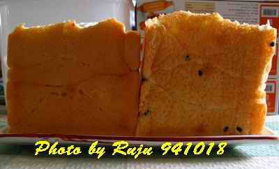 左邊的麵包吃起來口感及味道比較適中,只有很淡的百香果味道,烤出來麵包比較白。