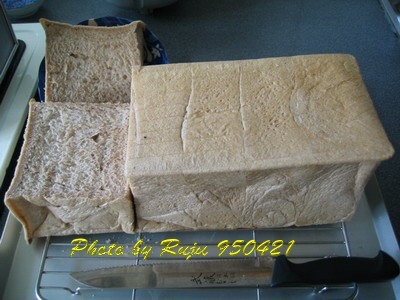 因為那台烤箱的計時器早就已經變啞巴了,而我又偷懶没設定電子計時器ㄇㄟ,等我猛然想到已經為時已晚,只得取出塑膠帶把急於逃脫吐司盒的麵糰分成兩糰裝入塑膠袋中,請入冰箱冷凍庫囉!