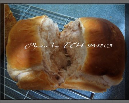 晚上老公竟又迫不及待的做了一次,他說這次要做成土司,結果葡萄乾忘記包進去,所以他說這次只能說是紅酒吐司了,因為晚上後發用了90分鐘,麵糰還只是7分滿的高度,所以就沒蓋蓋子,想說做成五峰就好了,結果烤了15分鐘要翻面時,竟然超出模子,差點頂到烤箱頂部了,所以有一塊特別黑,於是幫他加蓋了鋁箔紙,顏色還算OK,140/190,烤15分鐘,掉頭,100/190(加蓋鋁箔紙),烤1517分鐘。
