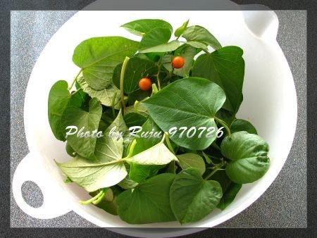 今天在陽台採的地瓜葉跟小番茄(野生番茄),其實前兩天我已經採過一次地瓜葉了,比這次更多,分了3次吃完了,這次的量應該分2次差不多,所以最近只有買杏鮑菇跟豆腐、豆乾,沒買菜,肉暫時先用豆腐代替吧!