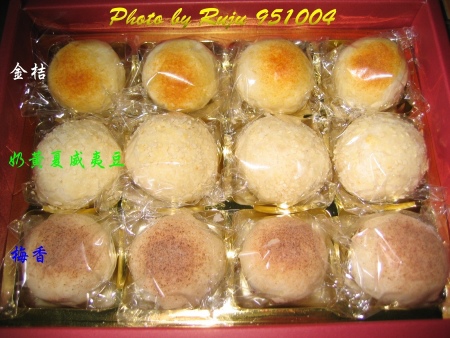 奶黃起士是前年在CL家曾經討論過的桃山奶黃酥,當時吃過之後印象深刻,可是今年好像當初的餡料工廠沒再生產此種口味,真是令人含恨啊!所以今年試著自己調整內餡配方,這是第二次調整了(夏威夷豆),口味比第一次(耐烤麻糬)試的味道好太多了,真是。。。高興啊!